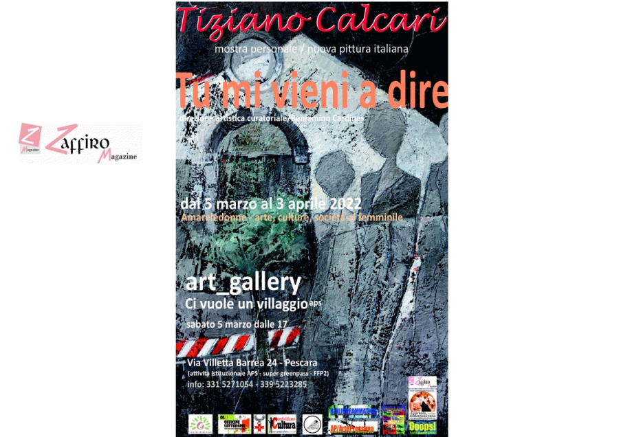 Sabato 5 marzo dalle ore 17, inaugurazione di “Tu mi vieni a dire” mostra personale dell’artista bresciano Tiziano Calcari a “Ci vuole un villaggio aps_ArtGallery” (Via Villetta Barrea 24 a Pescara). La mostra, che proseguirà fino a domenica 3 aprile 2022, apre il progetto “Amareledonne – arte, culture e società al femminile” a cui partecipa l’Assessorato alle Pari Opportunità del Comune di Pescara e Eracle aps.