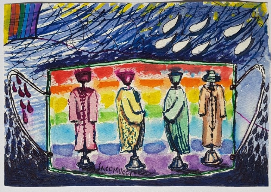 In tempo di pandemia e di misure restrittive di salute pubblica, il maestro Carlo Iacomucci ci delizia la vista e lo spirito, con le sue creazioni frutto di una indomita e inesauribile voglia di "fare arte" nonostante tutte le restrizioni e le privazioni imposte dal momento contingente. Le mascherine d'artista sono un messaggio di speranza per il futuro, rappresentando un simbolo di protezione verso l'esterno, ma al tempo stesso anche un palcoscenico cromatico, quasi un inno alla vita e alla rinascita, di fronte al nemico invisibile che colpisce silenzioso, provocando una sensazione di sgomento e di impotenza. Fuori dai contorni della mascherina, la presenza di un arcobaleno particolarmente vivido, a testimoniare la speranza di un futuro migliore libero, una volta per tutte, dalla malattia e dal dolore. L'arte, ancora una volta, costituisce un'arma molto potente per contrastare gli effetti di questa particolare situazione di solitudine e di isolamento, rappresenta un momento positivo per non farsi venire pensieri negativi e perciò la realizzazione di opere, diventa un motivo in più per riflettere e approfondire temi umanamente e psicologicamente poco piacevoli.
