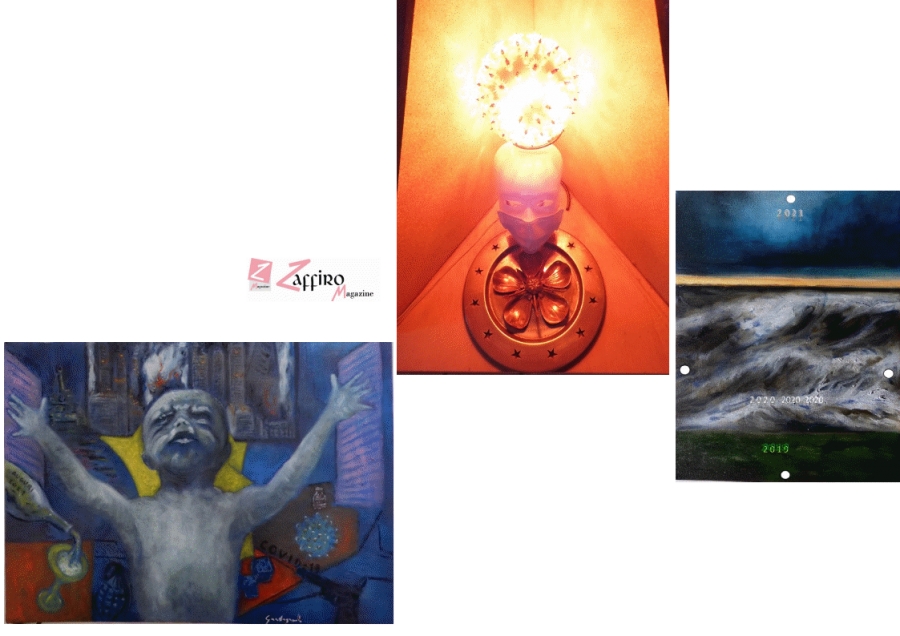 La tela è divisa in tre parti, nella parte sottostante è simboleggiato l’anno 2019 con un verde scuro con un’aspettativa dell’allora 2020. Al centro un mare in tempesta con onde altissime con difficoltà a superarle è il 2020 simbolo della pandemia da Covid-19. La parte sovrastante è l’alba del nuovo anno 2021 con un barlume di luce che indica che stiamo uscendo dal tunnel della catastrofe che ha infettato il mondo intero, causando più 1,5 milioni di morti.