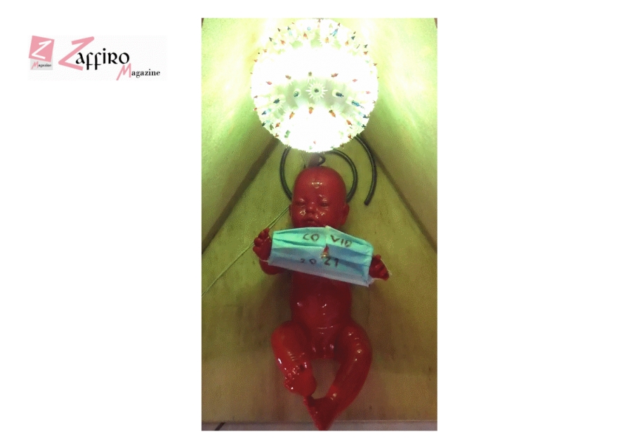 L’installazione “Covid 2021 - Nuova vita” del noto artista Francesco Guadagnuolo ferma l’attenzione sulla nascita che è l’istante in cui la nuova vita giunge al mondo e non c’è opera d’arte più esaltante a manifestare tale momento. Il parto, da poco finito, produce una relazione intensa di ottimismo verso l’attaccamento alla vita contro il virus che attanaglia il mondo intero. Il neonato messo al mondo, la prima cosa che fa, si aggrappa alla mascherina chirurgica squarciandola, cancella il Covid-19 portandosi via l’Anno che tanto ci ha fatto patire, come simbolo di difesa della vita stessa. Il virus rappresentato con le sue terribili spinule, si trasforma in luce verde, colore della speranza.