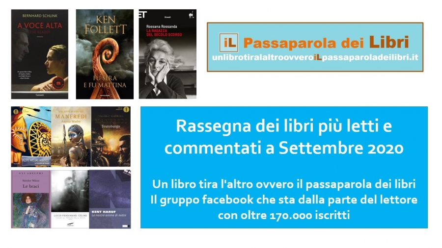 Nel mese di settembre i libri più commentati nel gruppo sono strati: A voce alta, capolavoro di Bernhard Schlink che racconta una storia di passione e presa di coscienza . Al secondo posto fa il suo ingresso Fu sera e fu mattina, nuovo romanzo di Ken Follett che costituisce il prequel del famoso I pilastri della terra; infine terzo posto per La ragazza del secolo scorso, l'autobiografia di Rossana Rossanda, recentemente scomparsa. L'autore più citato del mese è Valerio Massimo Manfredi, i cui nome è sempre molto presente n tra i consigli dei lettori: tra i suoi romanzi, i più amati sono senza dubbio Lo scudo di Talos, romanzo che ripercorre le vicende delle Guerre Persiane, Antica Madre, ambientato tra i legionari di Nerone e Teutoburgo, che racconta l'epica battaglia tra i barbari di Arminio e i romani. Questo mese, la libreria San Michele di Albenga consiglia per voi: Un capolavoro che lascia cicatrici: “Viaggio al termine della notte” di Celine (Corbaccio). Un colpo di genio, breve ma perfetto: “Le braci” di Marai (Adelphi). Un racconto profondo e delicato che non si scorda. “Le nostre anime di notte” di Kent haruf (NN editore). Per rimanere sempre aggiornati sul mondo dei libri e delle letteratura venite a trovarci sul nostro sito ufficiale e scoprite ogni settimana i consigli letterari del nostro canale YouTube! A presto e buone letture!