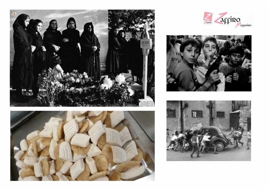 E paria na festa, na ddu campusantu, cu na caterva di genti e di sciuri di vuci assicutati ormai di ciantu di ciantu assicutatu di duluri. “Poi ricambianu, i morti, e tali e quali stanotti poi ti portanu i rijali.” E ammenzu a qualchi vesti e iucareddu nuci e nuciddi, mennuli, azzalori ficu, pupi di zuccuru, a punzeddu la frutta marturana. Eh, i viscuotti ciamati l’uossa re muoticieddi. Era l’arrusbigghiata dda jurnata pi la ricerca di la ncannistrata. Chista, la nostra. La festa de’ morti, quannu cu cera nenti ed erumu felici e cuntenti.